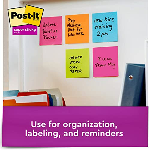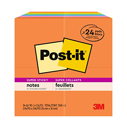 Post-it Super Sticky Notes, 3×3 in, 24 Pads, 2x the Sticking Power,Energy Boost Collection, Bright Colors (Orange, Pink, Blue, Green), Recyclable (654-24SSAU-CP)